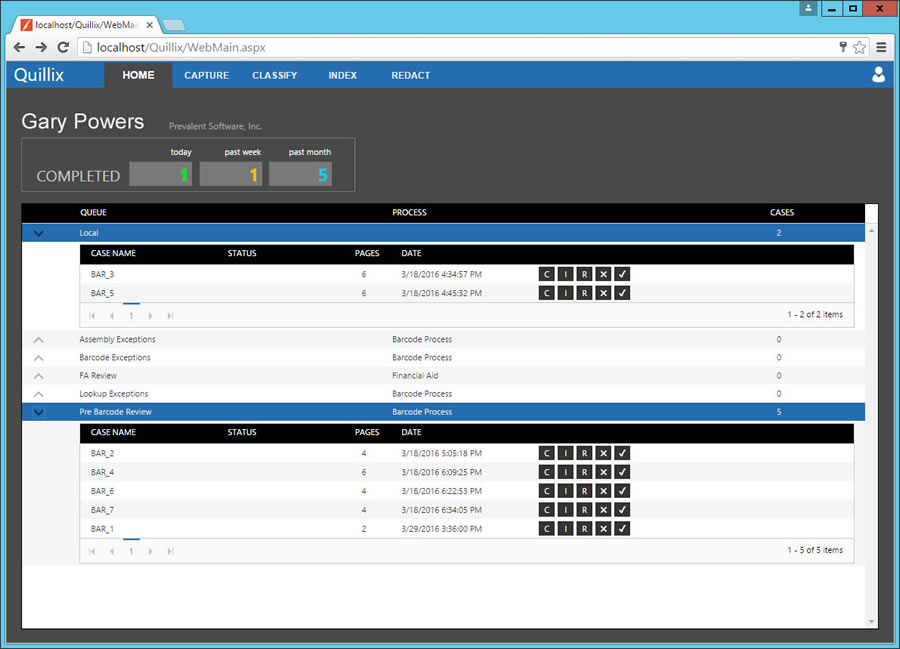The Quillix Dashboard provides an overview of your outstanding work, and your progress. From the Dashboard you can see every queue that is assigned to you, nand you can browse through a list of cases in each queue. The dashboard also provides case shortcuts for jumping right to a case to start working. The Dashboard is displayed initially upon login, and can be accessed at any time by clicking on the Home tab.