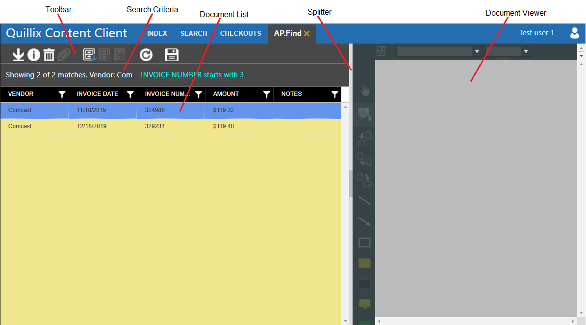 Each Result Panel is divided into four sections. A toolbar, an area to show the search criteria, a list of documents and a document viewer. Each row in the document list is a single document. The columns show the fields assigned to that document and the viewer will show the files assigned to that document. There is also a splitter between the viewer and the other sections. Dragging the splitter will resize the viewer pane. You may also click the darker section in the middle of the splitter to collapse the viewer.