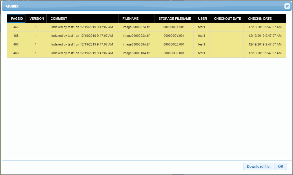 Result Panels are used to show the results of a search for documents. A search can be started from the Search Panel using the "Execute Search" button or from the Checkouts Panel using the "View Document" button. Result panels are created as needed by one of these two methods. The title of the Result Panel will be either the name of the Query used to open the panel (when created by the Search Panel) or the string "Document" (when created by the Checkouts Panel). When a search is executed and a Result Panel is needed, the open panels are checked first. If one already exists with the desired name, it is reused to show the results of the new search.
