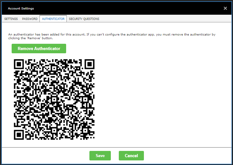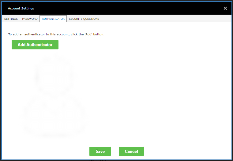 The 'account settings' window will be displayed. Select the 'authenticator' tab. If the tab is disabled, then your system administrator has not enabled this feature. If your account has an authenticator, you should see the following: