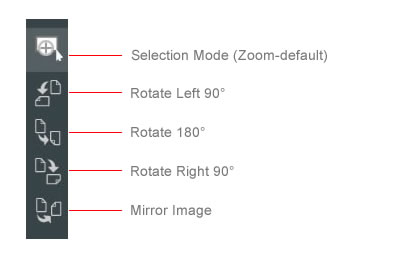 Image orientation can be changed if scanned or imported upside-down or sideways. The controls to perform image operations are located on the Image Toolbar on the left of the Document Viewer. The top button on the Image Toolbar is a multi tool button that lets you set the current selection mode. The remaining buttons are used to change the orientation of the displayed image.