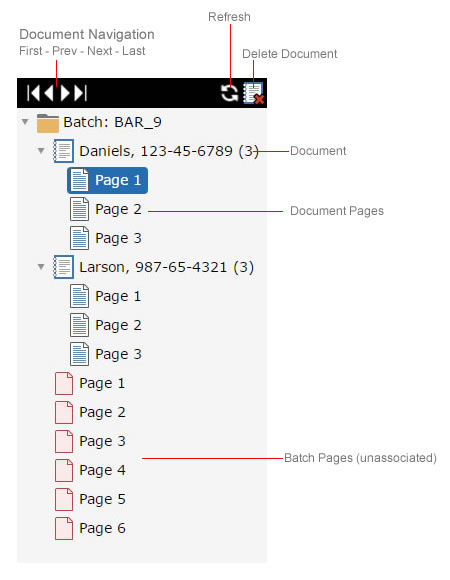 The Quillix Case Viewer provides an overview of the contents of a case, including unassociated batch pages, documents and document pages. The Case Viewer can be used for navigation, page re-ordering and for moving pages from one document to another, or to the batch.