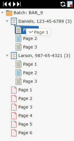 The Case Viewer can be used to re-order pages in a document, move pages from one document to another, or from a document to the batch (unassociating the page). Simply click on the desired page in the Case Viewer and drag it to its new position.
