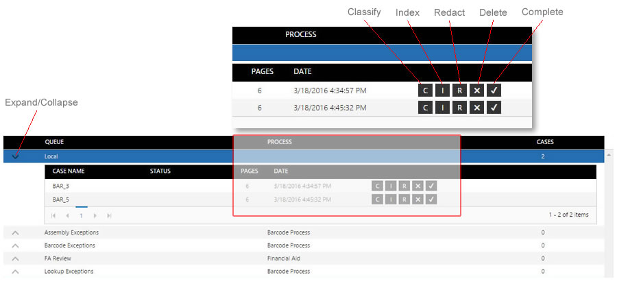 The Queue List provides an easy way to see all of your outstanding work in one place. It also provides a way to perform basic housekeeping tasks (like deleting and completing cases) depending on your user rights. There is a row in the list for each queue that is assigned to you. Each queue can be expanded by clicking the arrow indicator at the left of the queue name. When expanded, all of the items in the queue will be displayed below.
