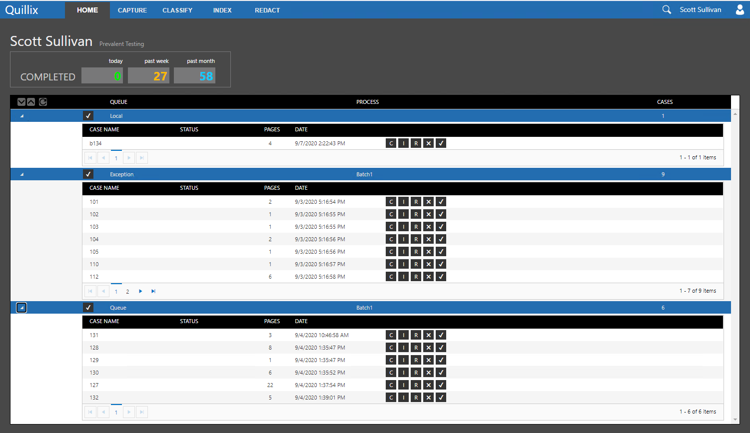 The Quillix Dashboard provides an overview of your outstanding work, and your progress. From the Dashboard you can see every queue that is assigned to you, and you can browse through a list of cases in each queue. The dashboard also provides case shortcuts for jumping right to a case to start working. The Dashboard is displayed initially upon login, and can be accessed at any time by clicking on the Home tab.