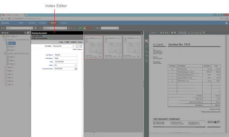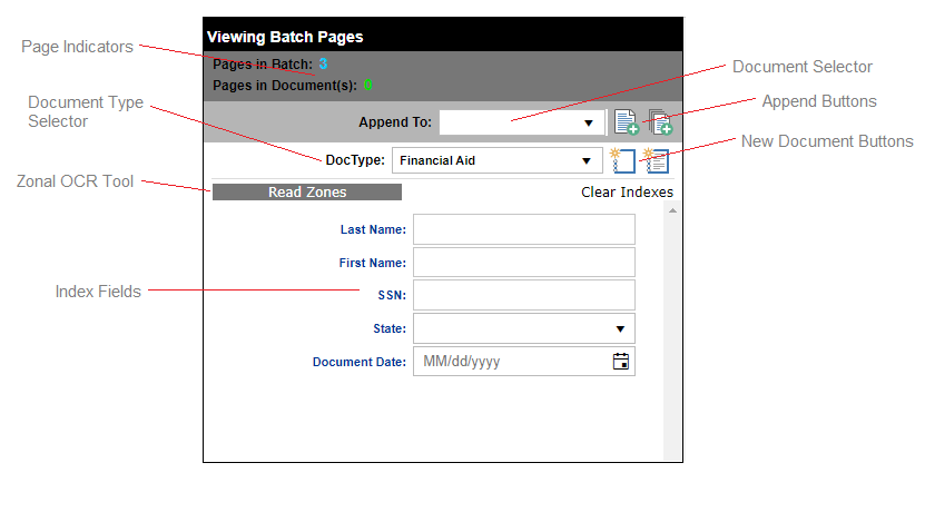 The Index Editor Controls are used to create new documents, add or edit existing document index values, and append batch pages to an existing document. Index fields may have additional properties as defined by an administrator that restrict entry to