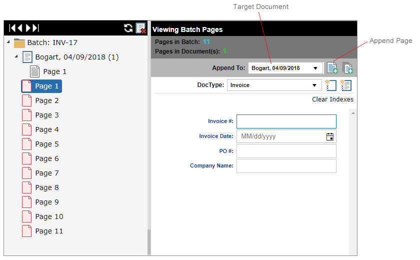 The process is then repeated for the remaining pages in the batch. For batch pages that belong to documents already created, select the target document from the Append To section of the Index Editor, and click the Append Page Button.