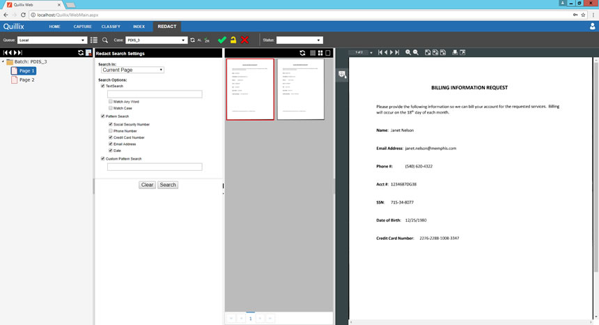 The majority of time lost in the manual redaction of documents is the act of visually reading through each document to identify the private data that needs redaction. This manual process is not only time consuming, but is also prone to human error as a result of repetition and fatigue. Quillix Redact improves productivity greatly by “reading” documents electronically and identifying redaction targets with eye pleasing targets. The operator can then focus on verifying the redaction targets quickly and accurately.