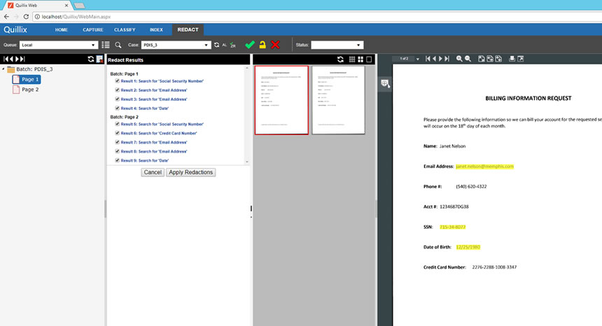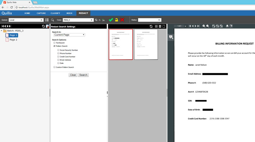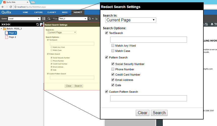 Select the Redact Panel in Quillix Web. Select a case to work (redact) from the queue list. Select the desired search options in the Search Settings area. Searches can be performed in a single page, across a document, a group of documents or an entire batch. Search criteria can be a combination of operator supplied text, pre-defined private data patterns, or a custom pattern. When the Search button is clicked, Quillix Redact will search through the specified grouping to find all redaction targets that match the search criteria.