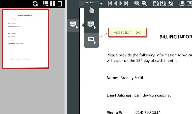 A Manual Redaction can be added to a page or document at any time using the Redaction Tool on the Viewer's flyout toolbar. Select the Redact Tool and use the mouse to draw a redaction over the area of the image you wish to redact.