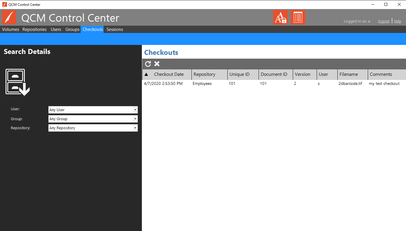 Document checkouts made through the QCM Web Client (and 4.x QCM Content Manager) will appear here. Use the refresh and delete options to manage document checkouts.