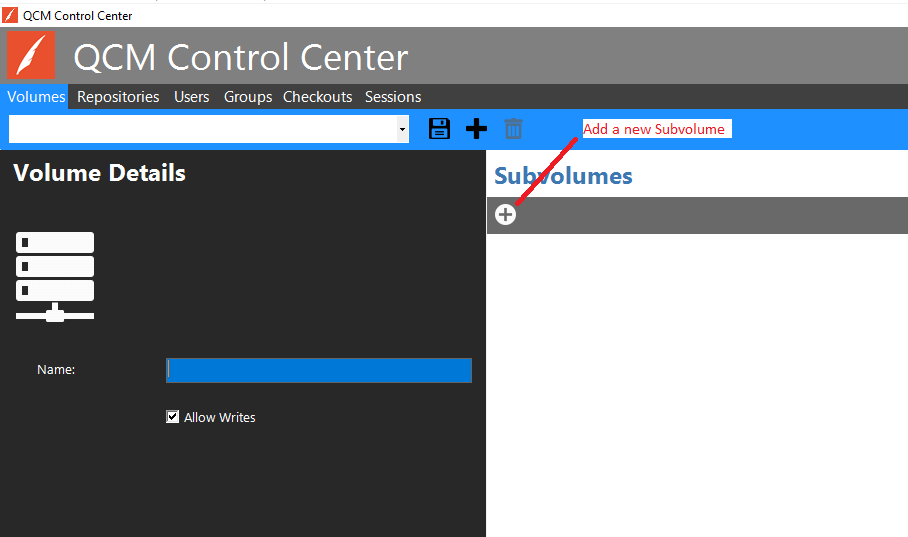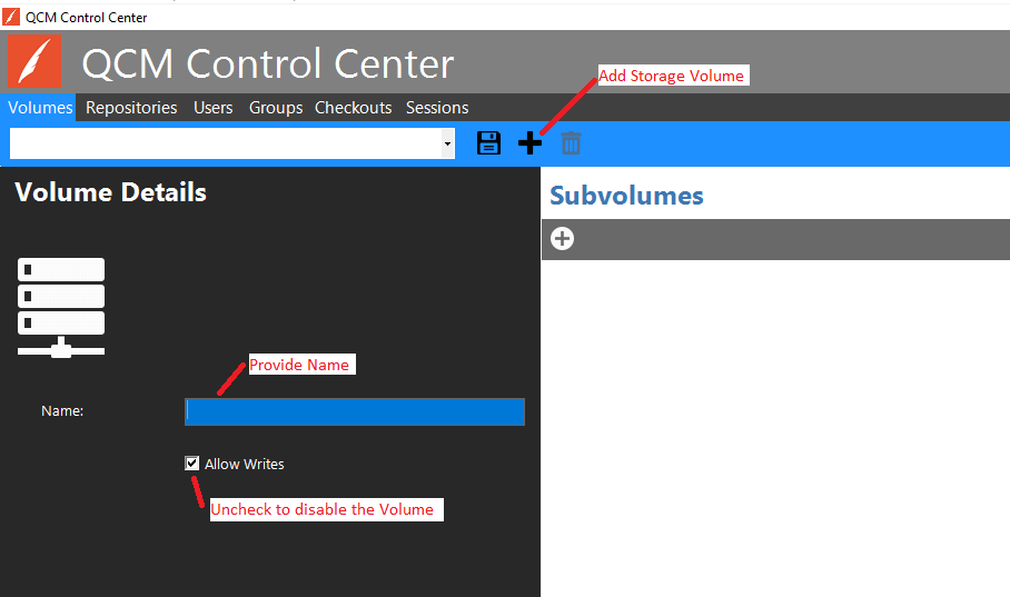 To add a new Volume, click on the Add Storage Volume button on the toolbar on the Volumes tab. Provide a name for the Volume and select whether or not to allow QCM to write to the Volume.