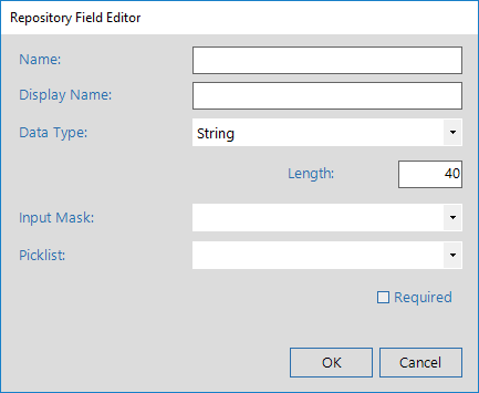 Name and Data Type cannot be modified once the Repository has been saved. The Required check box is not available once the Repository has been saved.