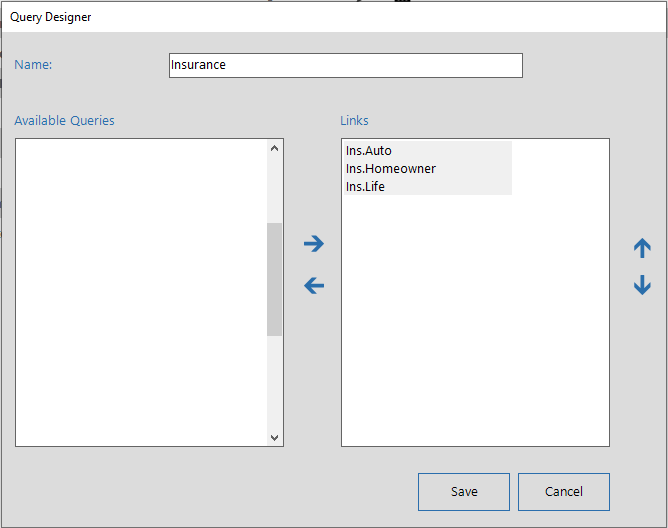 Provide a name for the Linked Query and move two or more Standard Queries from the 'Available Queries' list to the 'Links' list. A Linked Query combines the prompts of each link to execute the Links together as a single query. Likewise, the results are combined into a single grid. Prompts and Fields with the same DisplayName are combined.