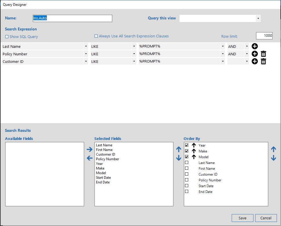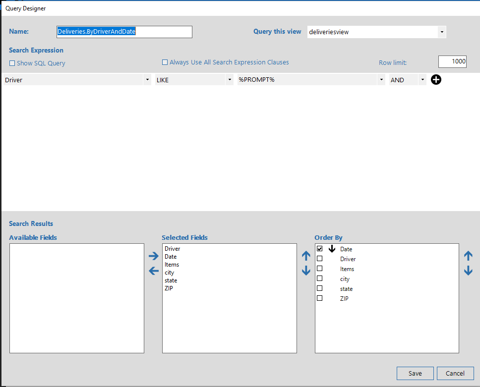 A SQL Query is generated from this dialog. Consider a simple SQL Query: 'Select FirstName, LastName from Employees where EmployeeID = 1 order by LastName asc'. The Search Expression is the 'where EmployeeID = 1' portion of the query. Selected Fields is the 'Select FirstName, LastName' portion, and Order By is, of course, the 'order by LastName asc' portion.
