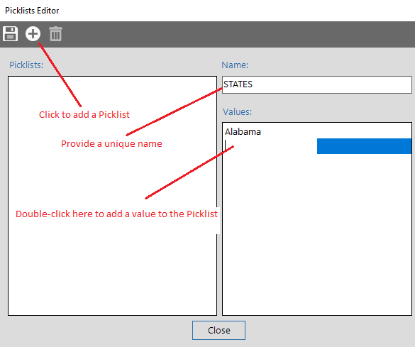 Click 'Add Picklist' to add a new Picklist. Provide a unique name for the Picklist. Add values by double-clicking in the Values list. Type in the value and press Enter to accept the value. Click the Save button to accept the Picklist.