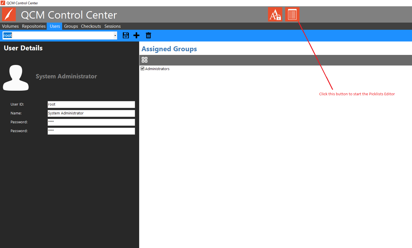 The Picklists Editor can be started in two ways. The first way is to click the Picklists Editor button from the QCM Control Center title bar, as shown here: