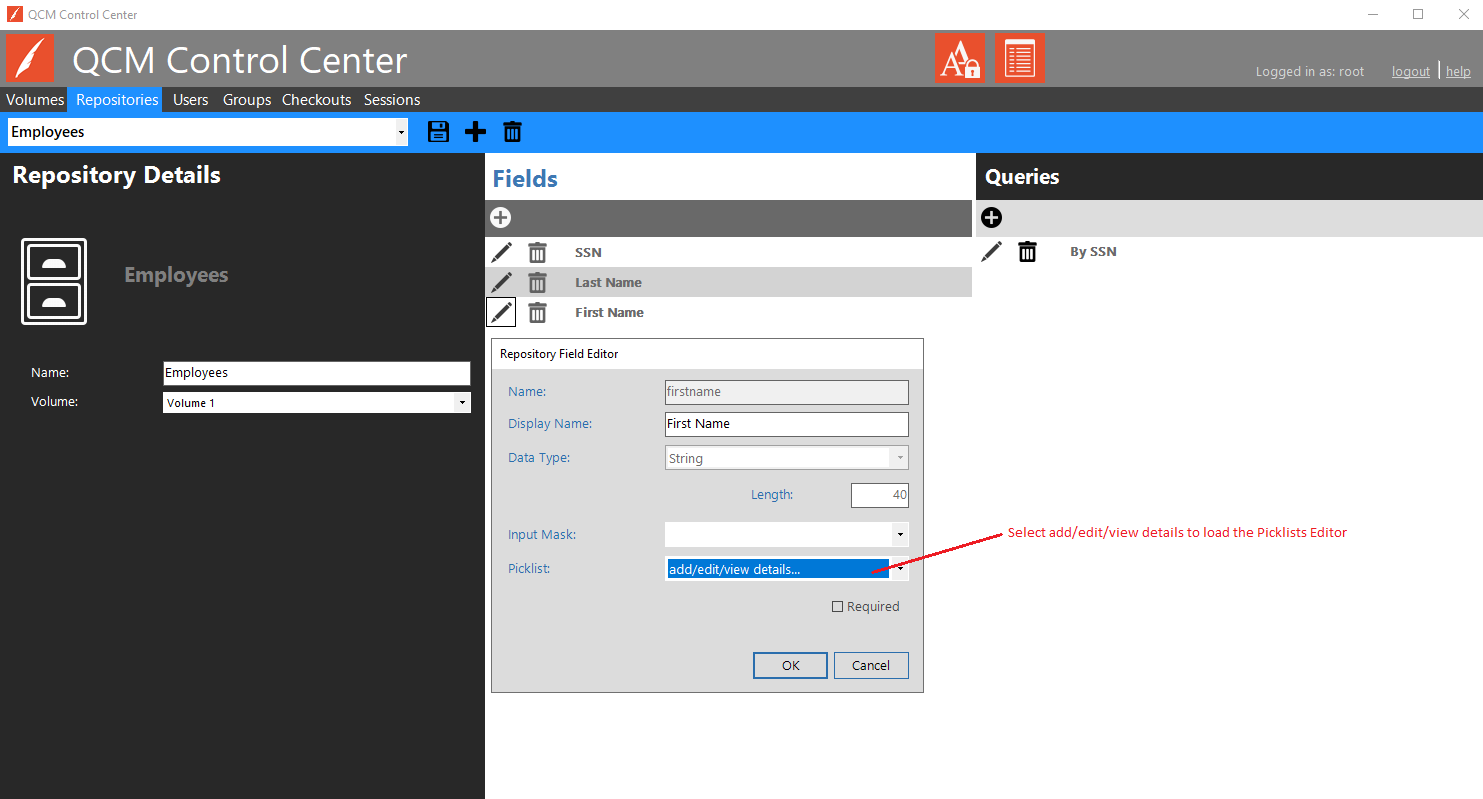 The Picklists Editor can also be started when editing or adding Repository Fields, through the Field Editor.