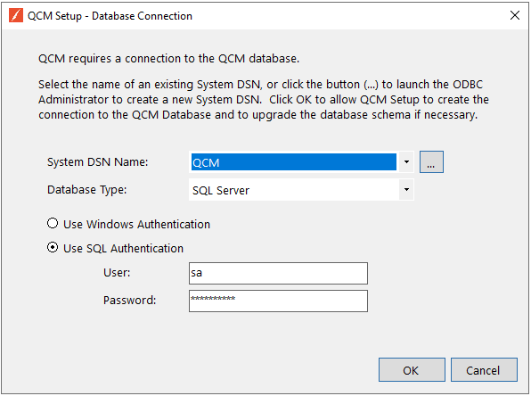 It is recommended to use Windows Authentication. The QCM Web Server will then connect using the account assigned as the Application Pool's Identity. The utility will upgrade the QCM database if needed. Once the database connections have been set, the web site can be configured.