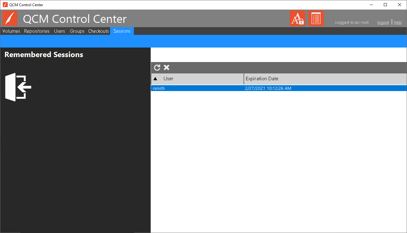 Sessions are added when a user selects the 'Remember Me' option when logging in to the QCM Web Client. A remembered session allows the user to skip the login dialog the next time the QCM Web Client is loaded. Use the refresh and delete options to manage remembered sessions.
